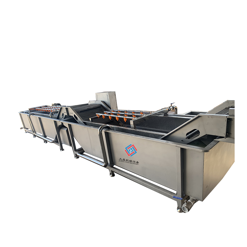 蔬菜清洗加工生產(chǎn)線/流水線的加工流程一般為:先將不可使用的部分取出進行分揀,經(jīng)過人工分揀之后將物料通過輸送帶輸送至下一道工序,通過氣泡清洗機對蔬菜進行清洗,物料會隨著水流輸送出,經(jīng)過二次噴淋后能提高清洗的效果。